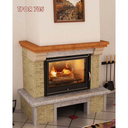 Компактная пристенная каминная облицовка Мета ТРОЯ 705 изготовлена из колотого доломита желтого цвета, натурального мрамора (бежево-серого цвета) с обработкой Антик и камня META Stone™ серо-белого цвета.